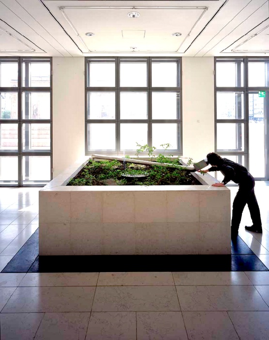 Regenwasser wird auf den Dachflächen gesammelt und über eine Regenrinne in einem Schacht im Innern des Gebäudes zunächst in ein Wasserreservoir geleitet. Dieser Behälter, der 1.500 Liter umfasst, ist eine Reserve für mögliche Trockenzeiten, die sich in der Zukunft ergeben könnten. Es ist eine Sicherheit für trockene Perioden. Dieses Wasserreservoir in der ersten Etage ist nicht öffentlich zugängig. Von dort aus wird das Regenwasser zu einem Biotop geleitet, das sich mit wuchernden Pflanzen im Eingang der Galerie der Gegenwart befindet. Das Wasser sickert durch die Erdschichten in weiterführende Leitungen und tropft, angereichert mit Kalk und Kohlendioxid, durch ein speziell entwickeltes Kapillarsystem in den „Maschinenraum“. Das im Biotop diagonal installierte Periskop ermöglicht bereits von oben einen ersten Blick in den darunter liegenden Maschinenraum. Hier befindet sich die Tropfstelle.